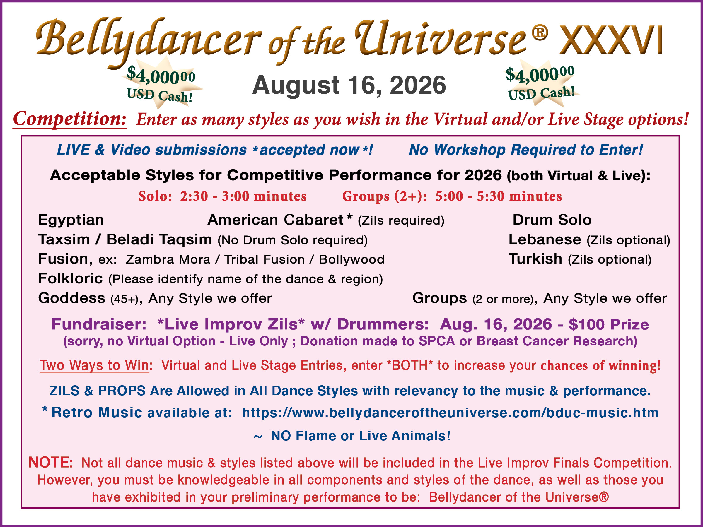 You can enter the Bellydancer of the Universe ® XXXVI Virtual Queen Competition with any performance and style you wish, as many times as you wish!