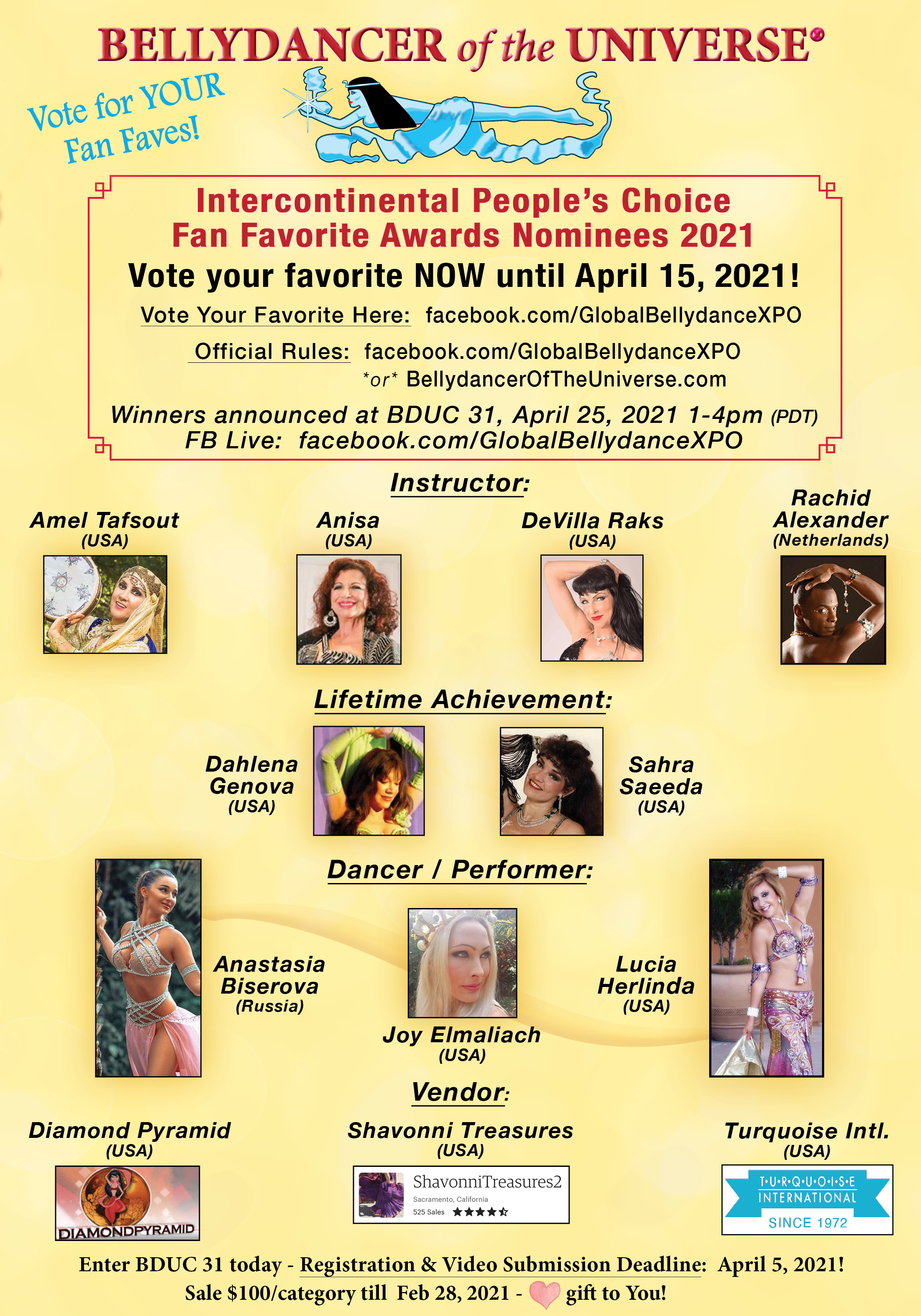 "Bellydance X-po™," "Belly Dance X-po™," "Global Bellydance X-po™," "Global Belly Dance X-po™, "Bellydance Xpo™," "Belly Dance Xpo™," "Global BellydanceXpo™," "Global Belly Dance Xpo™," "Bellydancer of the Universe®," "Belly Dancer of the Universe®," "Bellydance Universe®," "Belly Dance Universe®," and "BDUC" are trademarks of A. Long and the Bellydancer of the Universe® Competitions. Bellydancer of the Universe® intellectual property is protected by Federal Trademark.